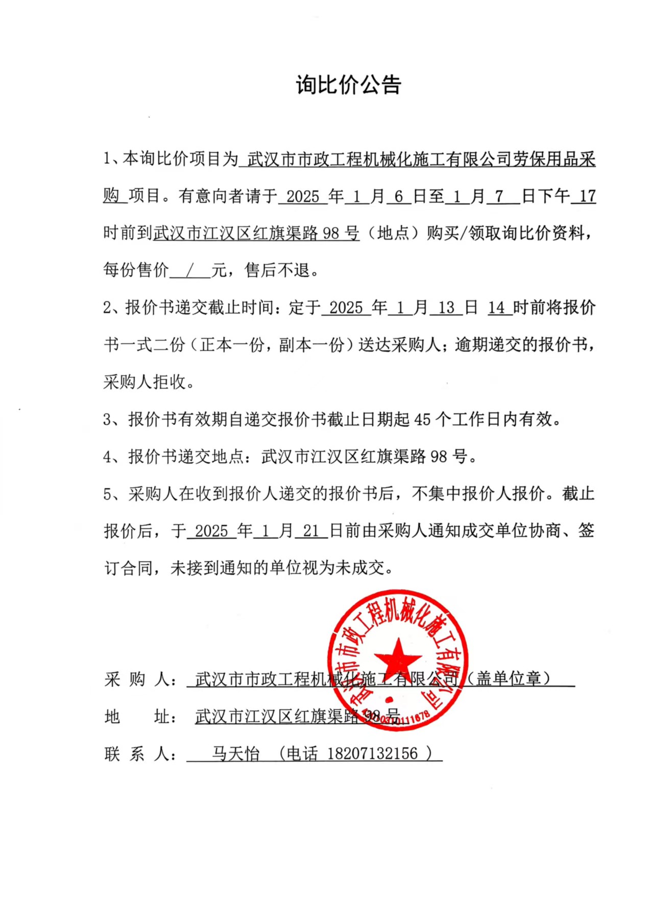 武漢市市政工程機械化施工有限公司勞保用品采購詢價公告