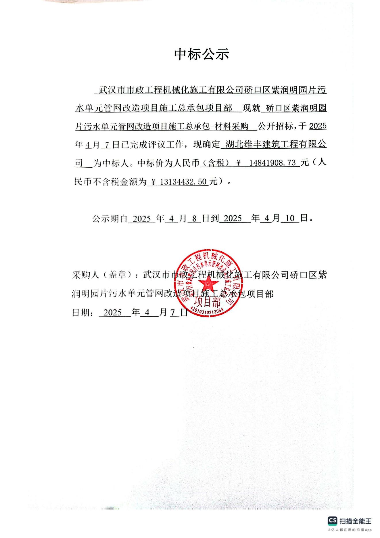 硚口區(qū)紫潤明園片污水單元管網(wǎng)改造項(xiàng)目施工總承包-材料采購中標(biāo)公示