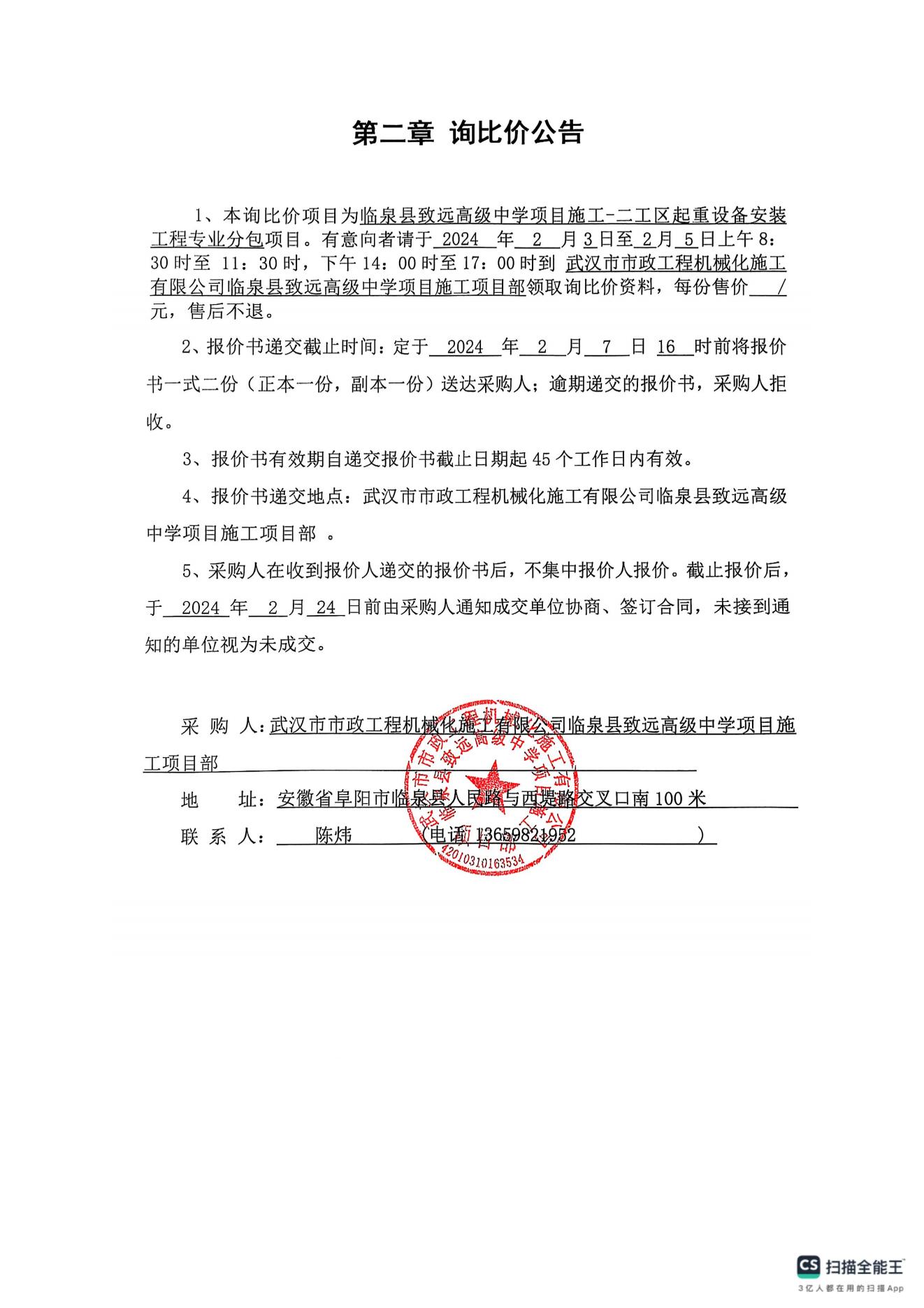 臨泉縣致遠(yuǎn)高級中學(xué)項(xiàng)目施工-二工區(qū)起重設(shè)備安裝工程專業(yè)分包詢價(jià)公告