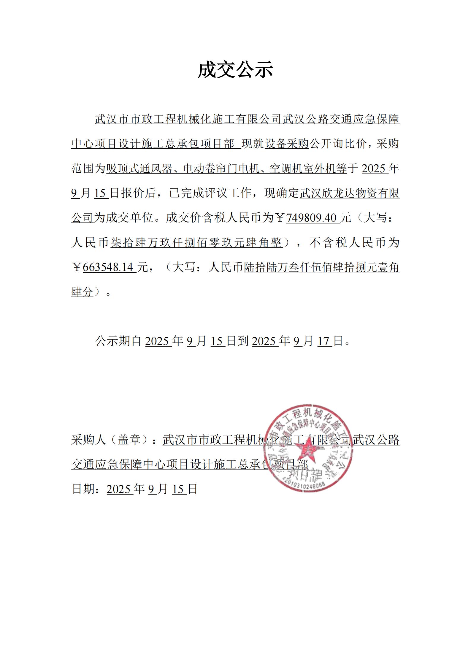 武漢公路交通應(yīng)急保障中心項目設(shè)計施工總承包項目設(shè)備采購成交公示