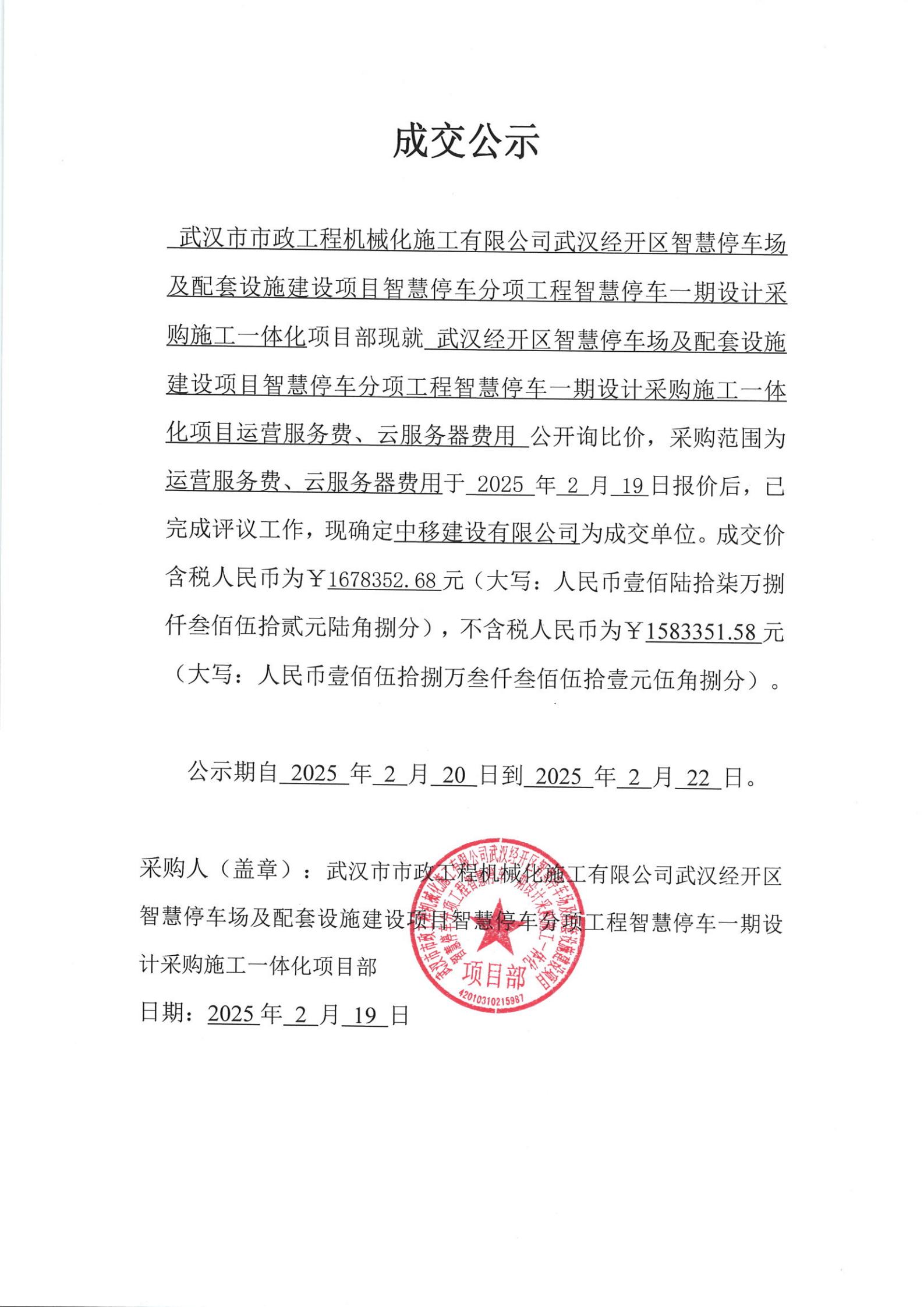 武漢經(jīng)開區(qū)智慧停車場及配套設施建設項目智慧停車分項工程智慧停車一期設計采購施工一體化項目運營服務費、云服務器費用成交公示