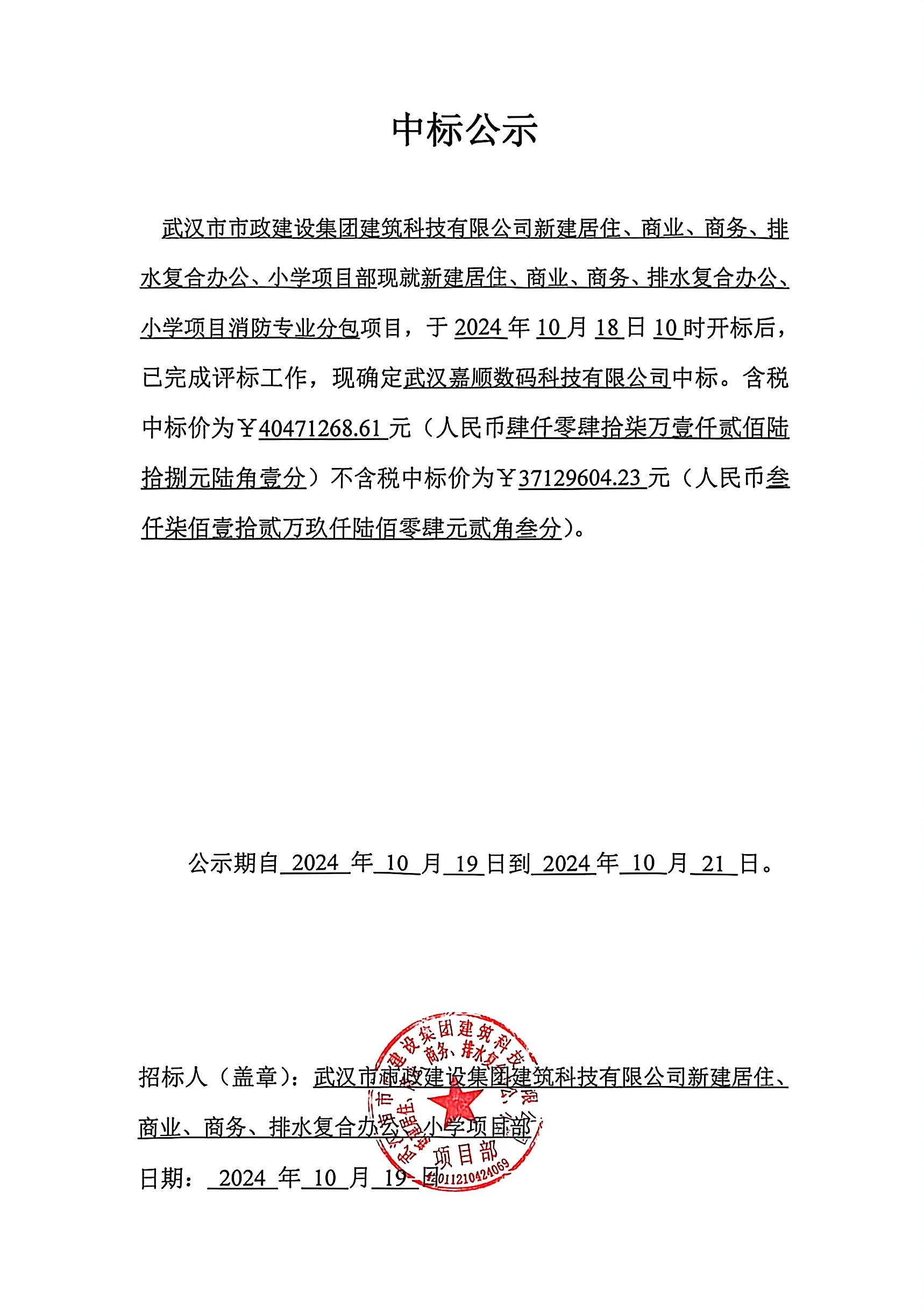 武漢市市政建設(shè)集團(tuán)建筑科技有限公司新建居住、商業(yè)、商務(wù)、排水復(fù)合辦公、小學(xué)項(xiàng)目消防專業(yè)分包中標(biāo)公示