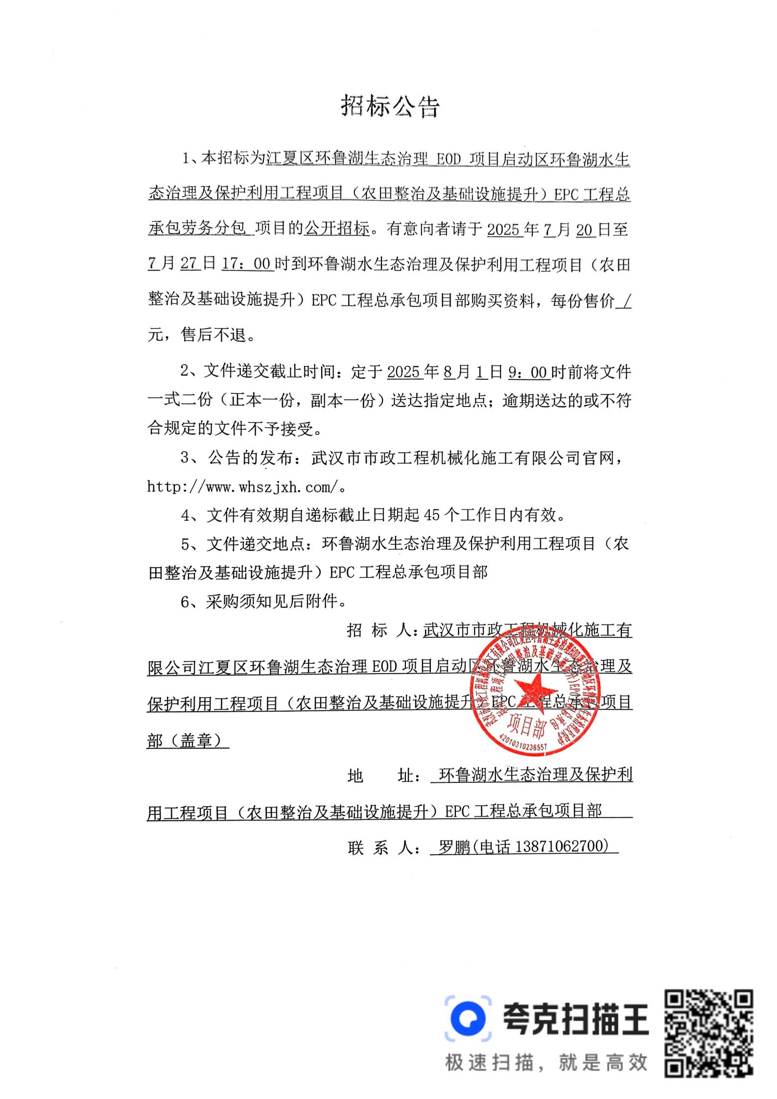 江夏區(qū)環(huán)魯湖生態(tài)治理 E0D 項(xiàng)目啟動(dòng)區(qū)環(huán)魯湖水生態(tài)治理及保護(hù)利用工程項(xiàng)目(農(nóng)田整治及基礎(chǔ)設(shè)施提升)EPC工程總承包勞務(wù)分包招標(biāo)公告