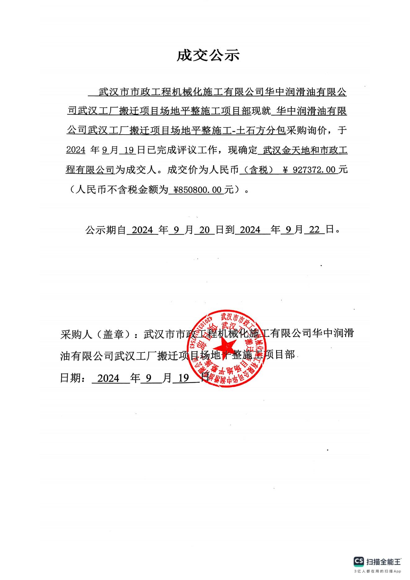 華中潤滑油有限公司武漢工廠搬遷項且場地平整施工土石方分包成交公示