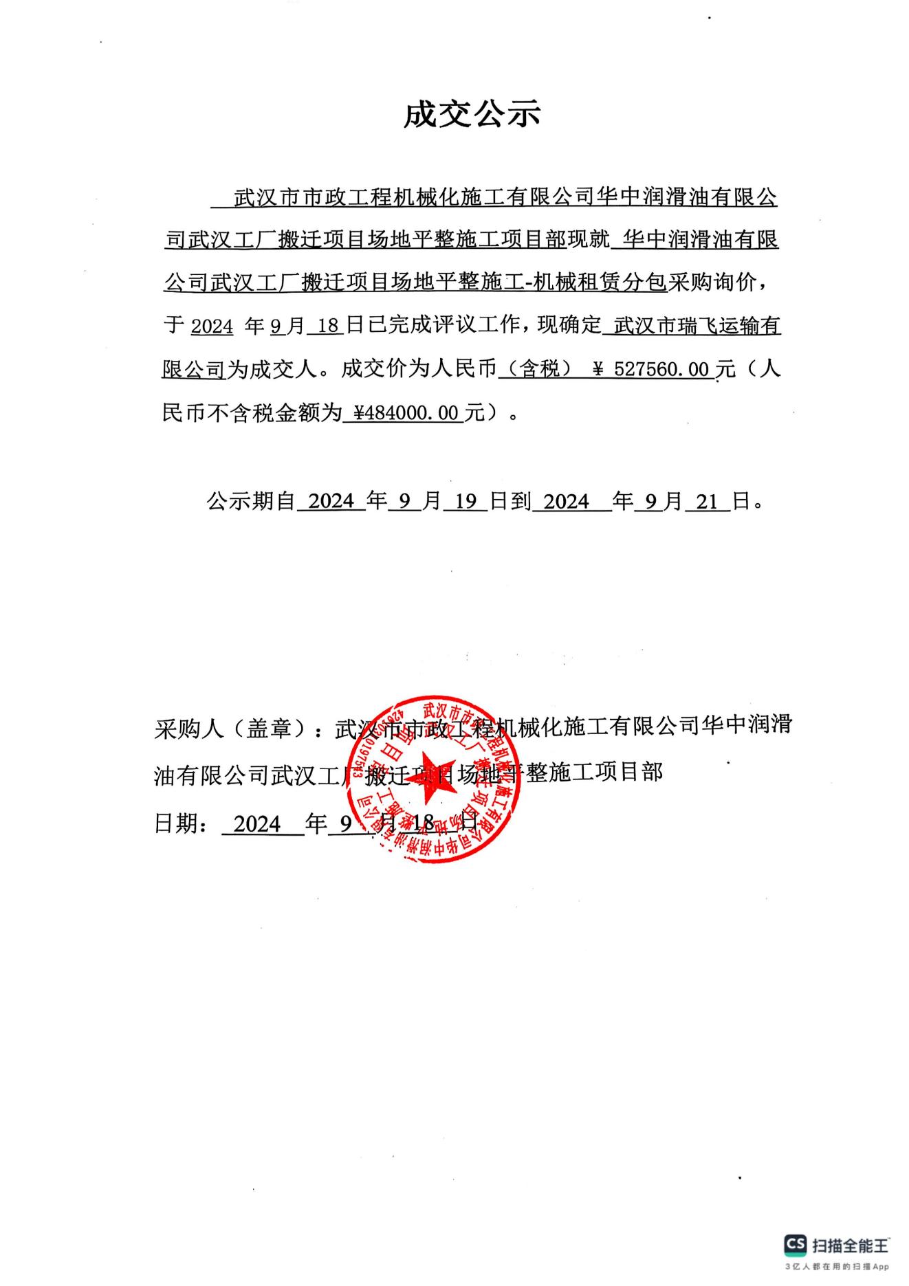 華中潤滑油有限公司武漢工廠搬遷項(xiàng)且場(chǎng)地平整施工機(jī)械租賃分包成交公示