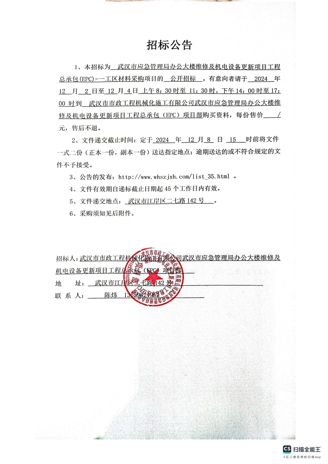 武漢市應急管理局辦公大樓維修及機電設備更新項目工程總承包(EPC)-一工區(qū)材料采購招標公告