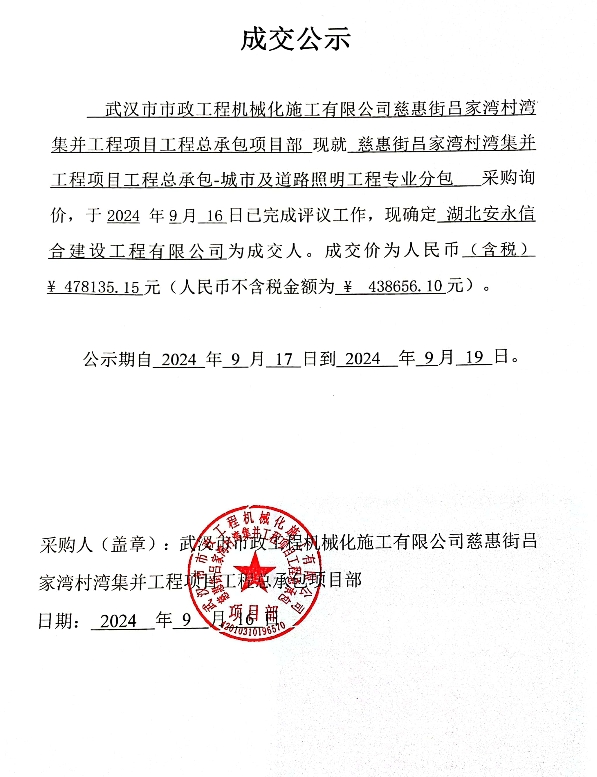 慈惠街呂家灣村灣集并工程項目工程總承包-城市及道路照明工程專業(yè)分包詢價公告成交公示
