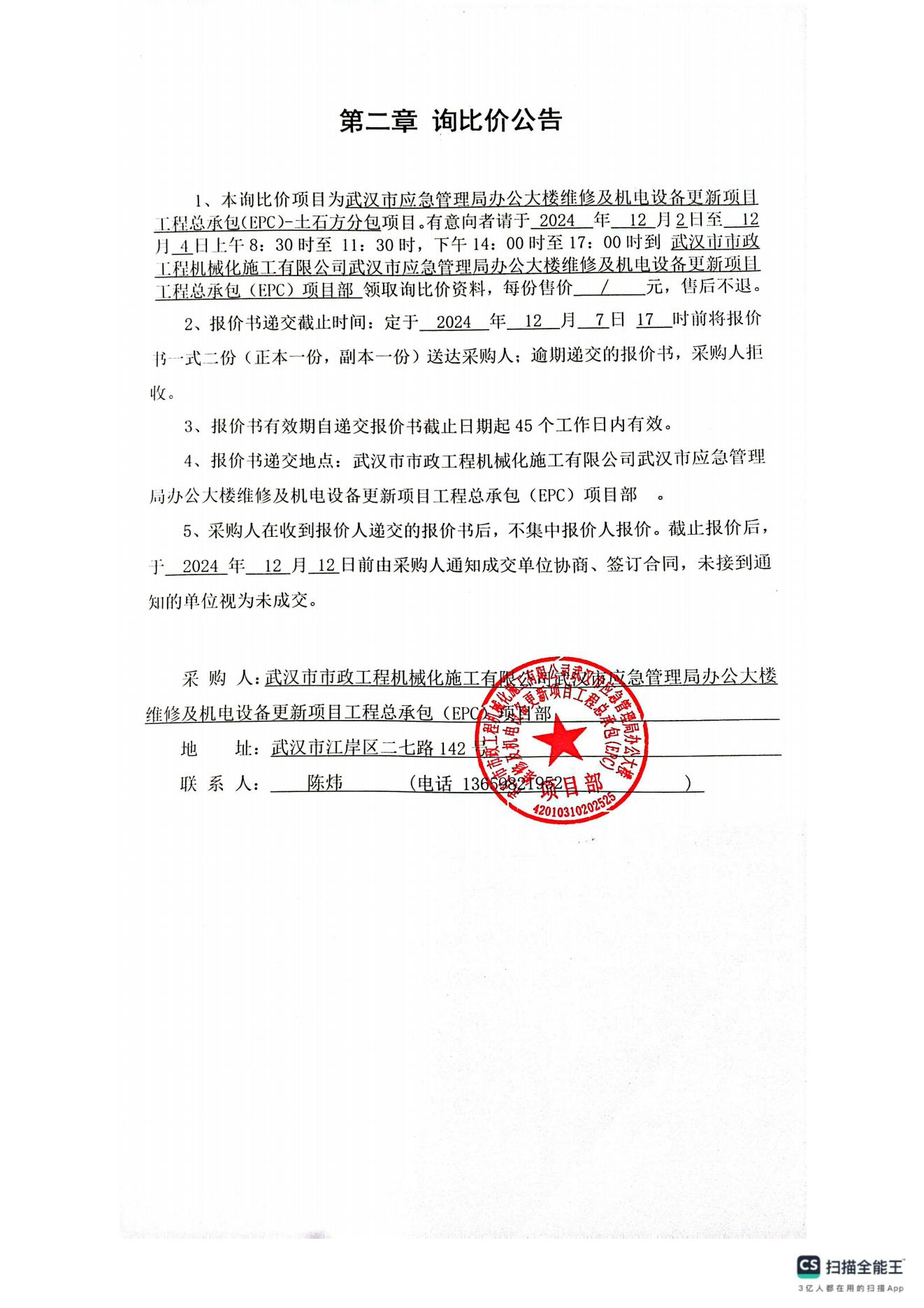 武漢市應(yīng)急管理局辦公大樓維修及機電設(shè)備更新項目工程總承包(EPC) -土石方分包詢價公告